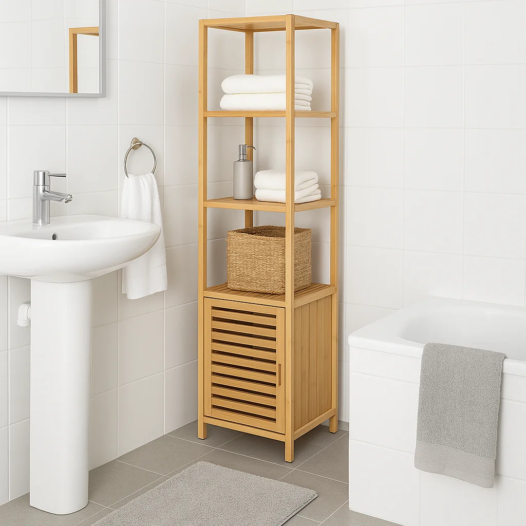 Stylový bambusový regál se skříňkou je ideální volbou pro každého, kdo hledá spojení funkčnosti, jednoduchosti a přírodního vzhledu.