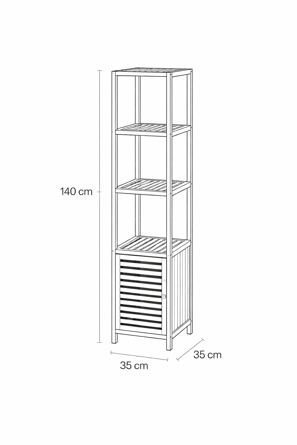 Tři otevřené police poskytují dostatek prostoru pro ručníky, kosmetiku nebo dekorace, zatímco spodní uzavíratelná skříňka umožňuje uložit věci, které chcete mít po ruce, ale ne na očích.