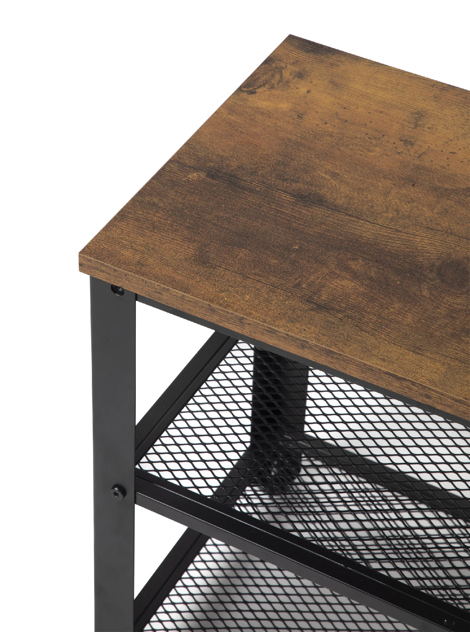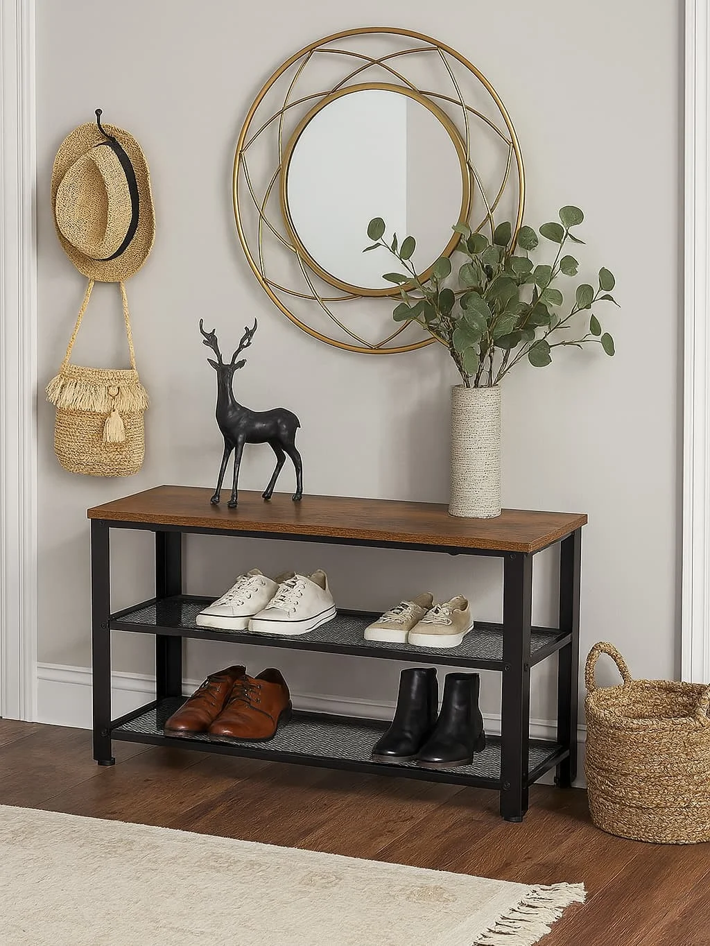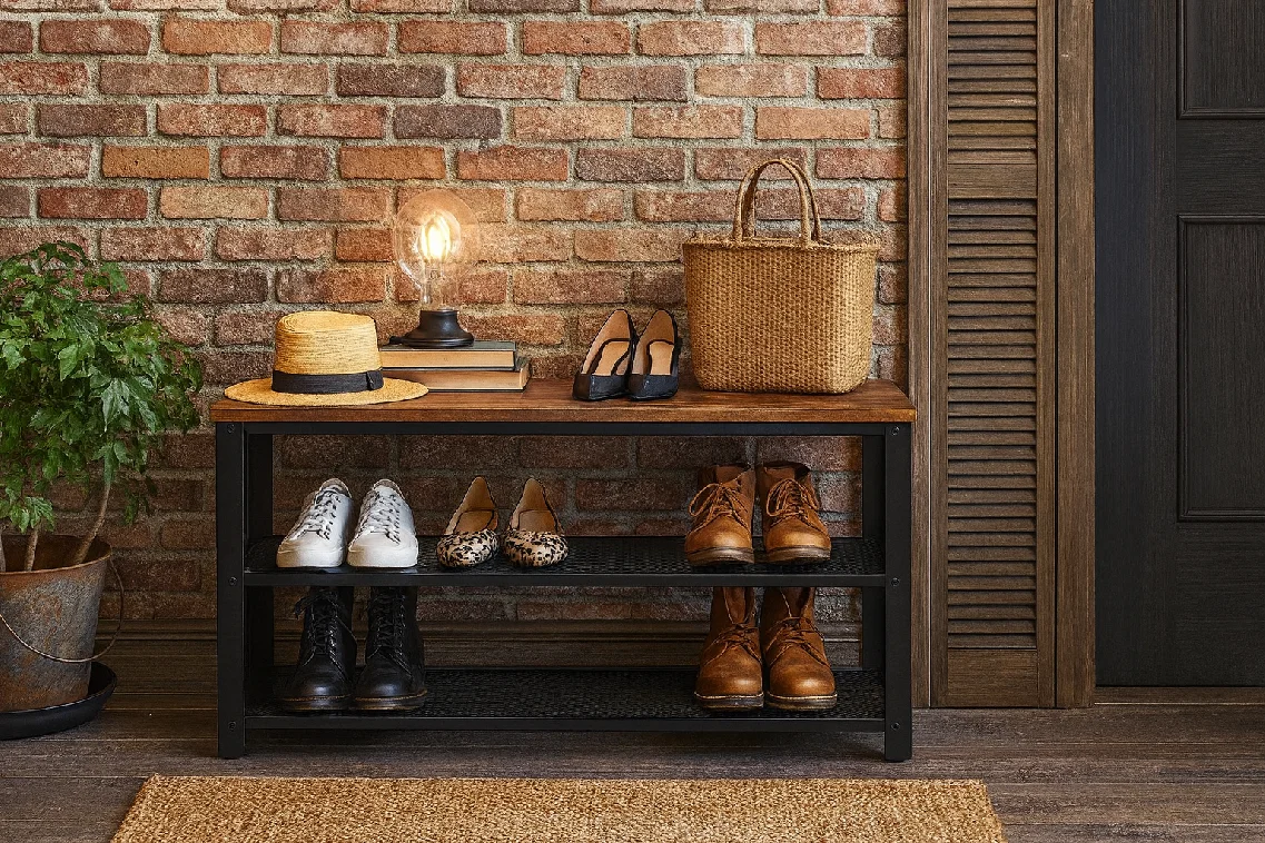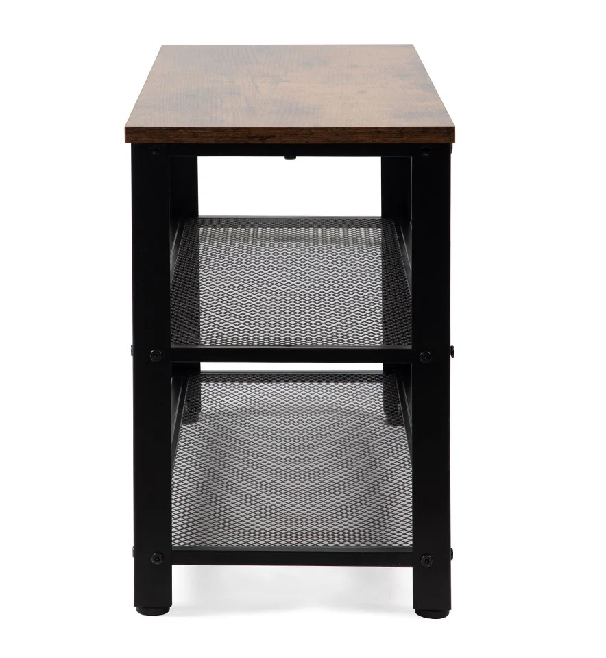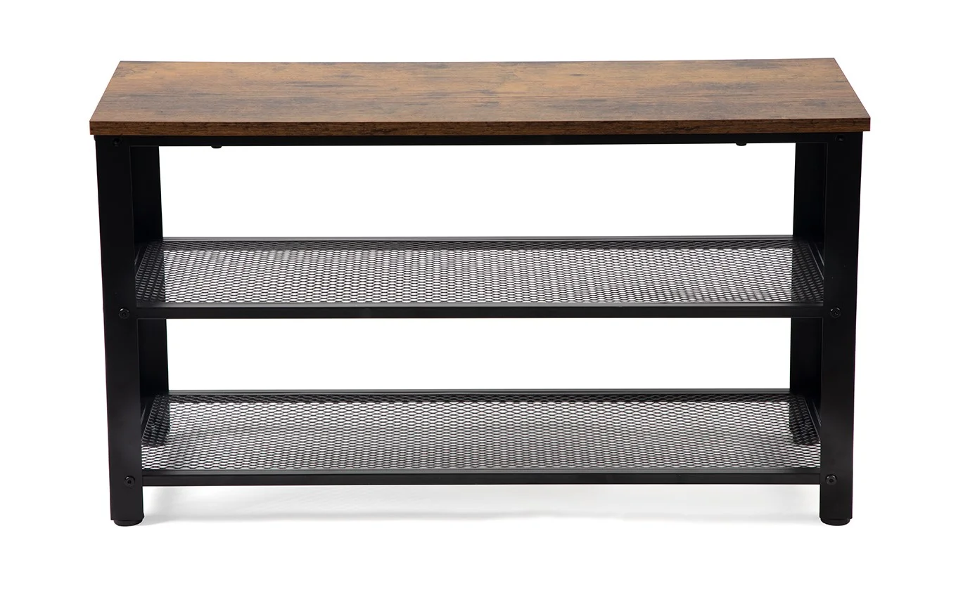 Botník s robustní kovovou konstrukcí a odolnou deskou. Dvě prostorné mřížkové police pro uložení obuvi a doplňků. Vrchní část lze využít jako odkládací plochu nebo lavici na sezení.