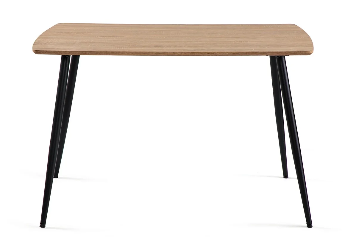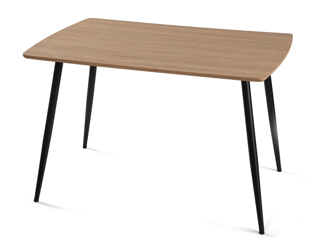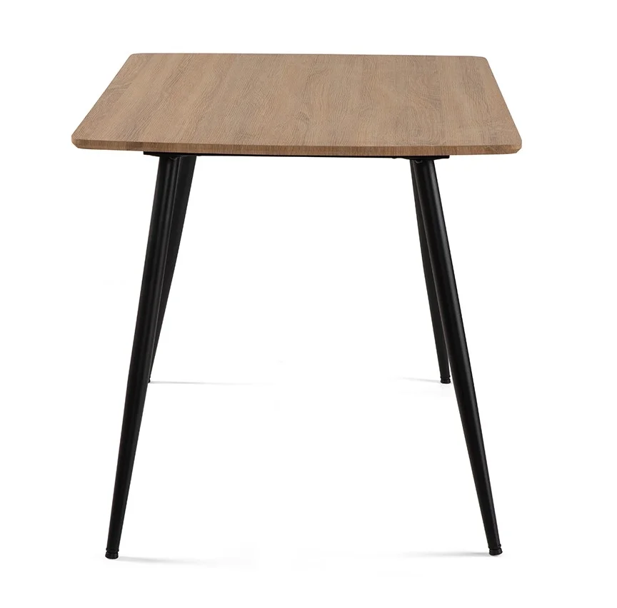 Jídelní stůl v dekoru přírodního dřeva je ideálním spojením moderního designu a přirozené elegance. Teplý odstín dřevěné desky vytváří příjemnou atmosféru a přináší do prostoru pocit útulnosti, zatímco minimalistické černé kovové nohy dodávají stolu moderní a lehce industriální charakter.