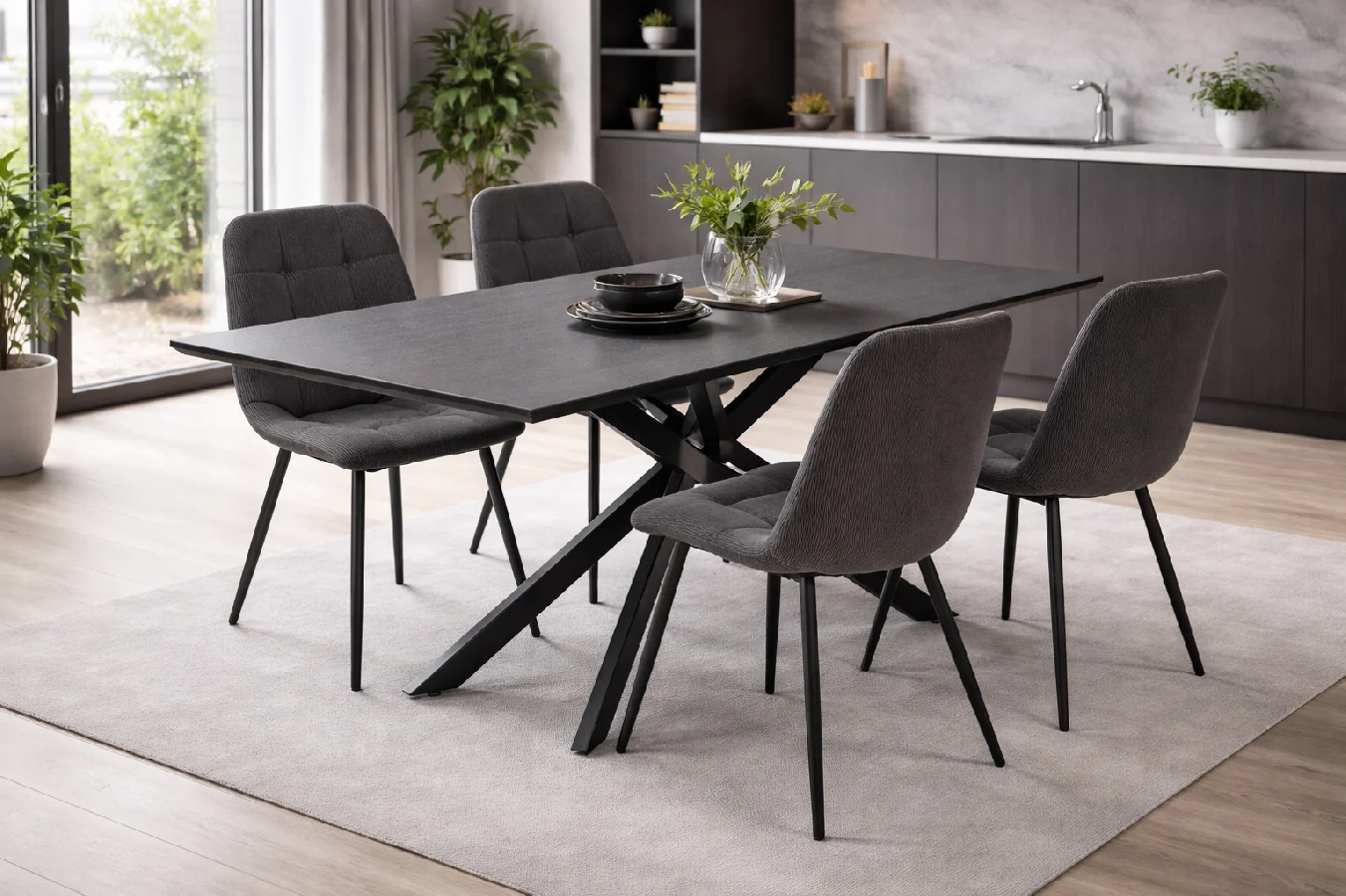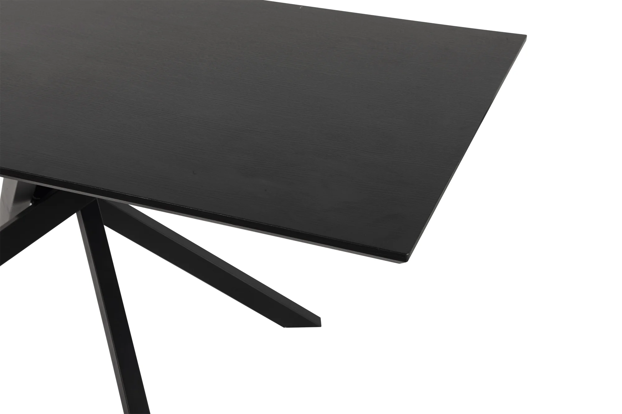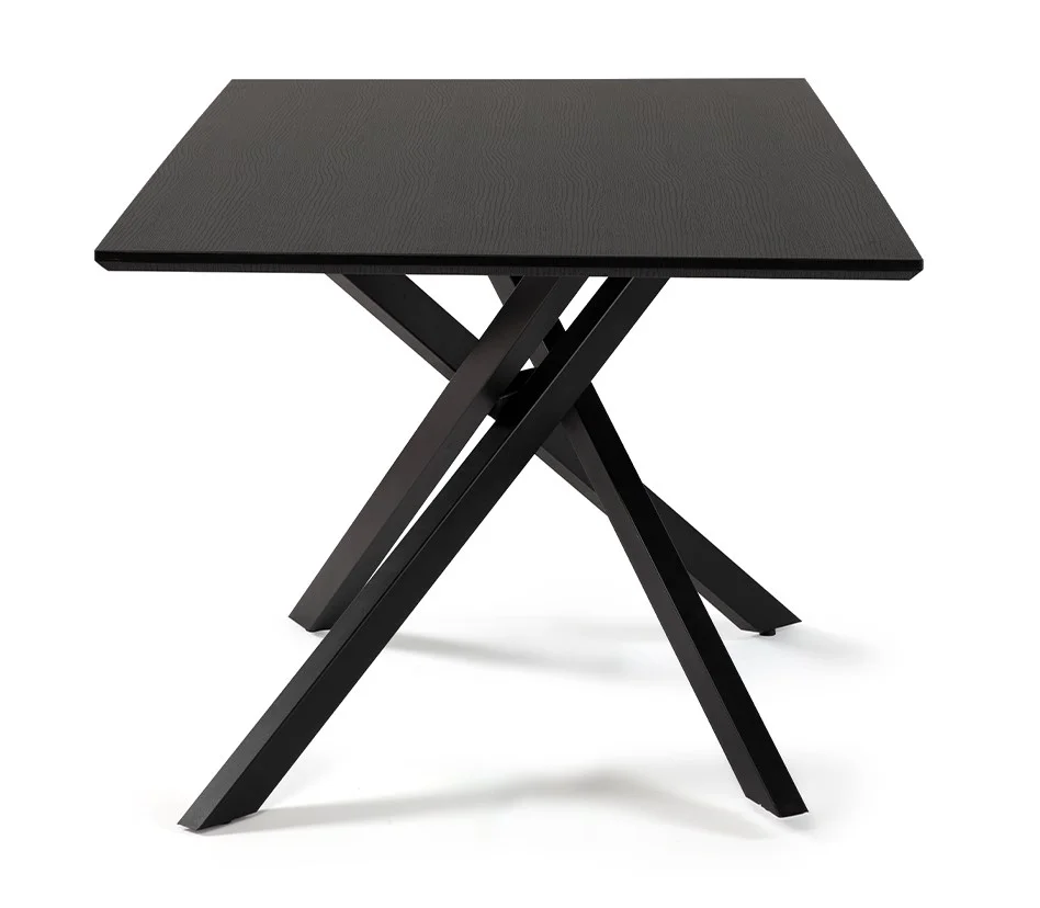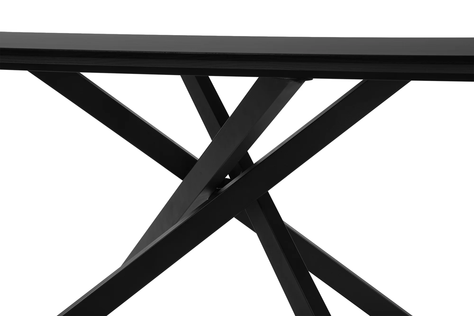 Obdélníkový jídelní stůl s výrazným moderním designem. Černá stolová deska dodává interiéru elegantní a luxusní vzhled. Stabilní kovová podnož s originálním křížením nohou. Vhodný do prostorné jídelny či moderní kuchyně. Spojuje praktičnost, pevnost a stylovou eleganci.