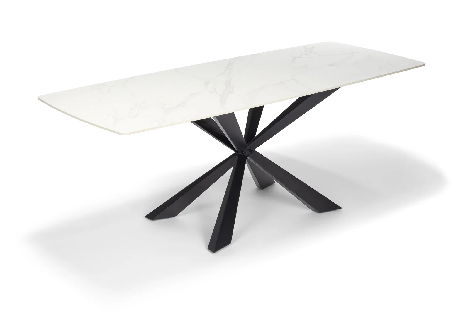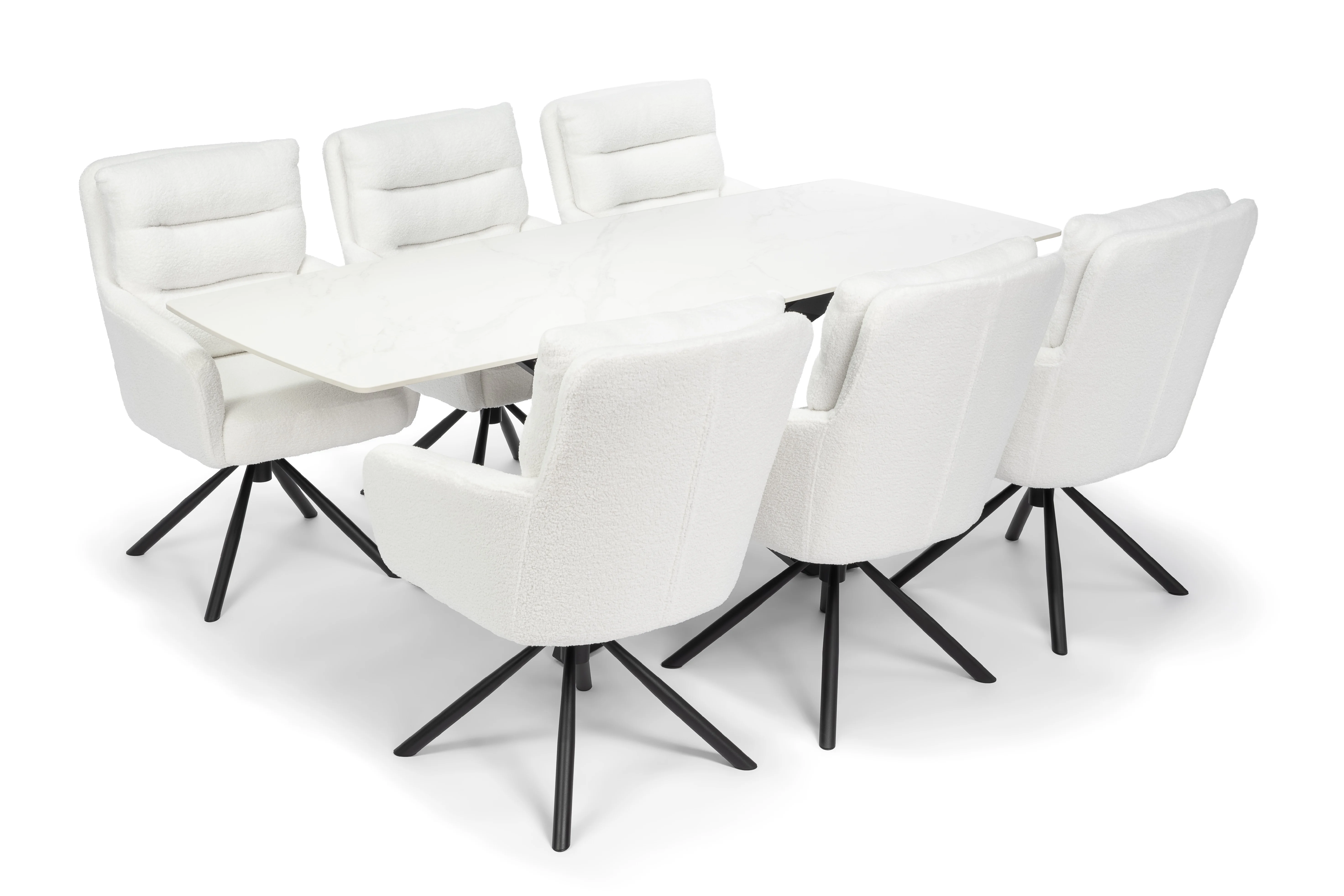 Tento jídelní set představuje dokonalou rovnováhu mezi moderní estetikou a každodenním komfortem. Dominantou je prostorný stůl s elegantní deskou v dekoru bílého mramoru, která působí čistě, luxusně a zároveň nadčasově. Stabilní podnož v černém provedení dodává celku vizuální kontrast a pevnost.