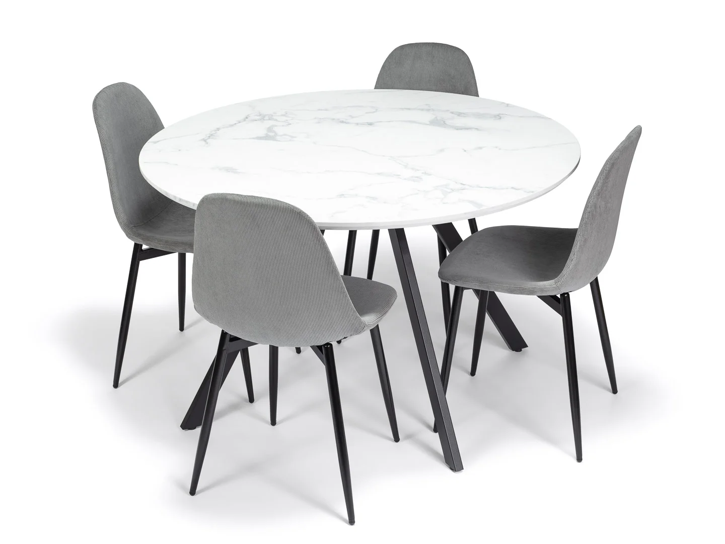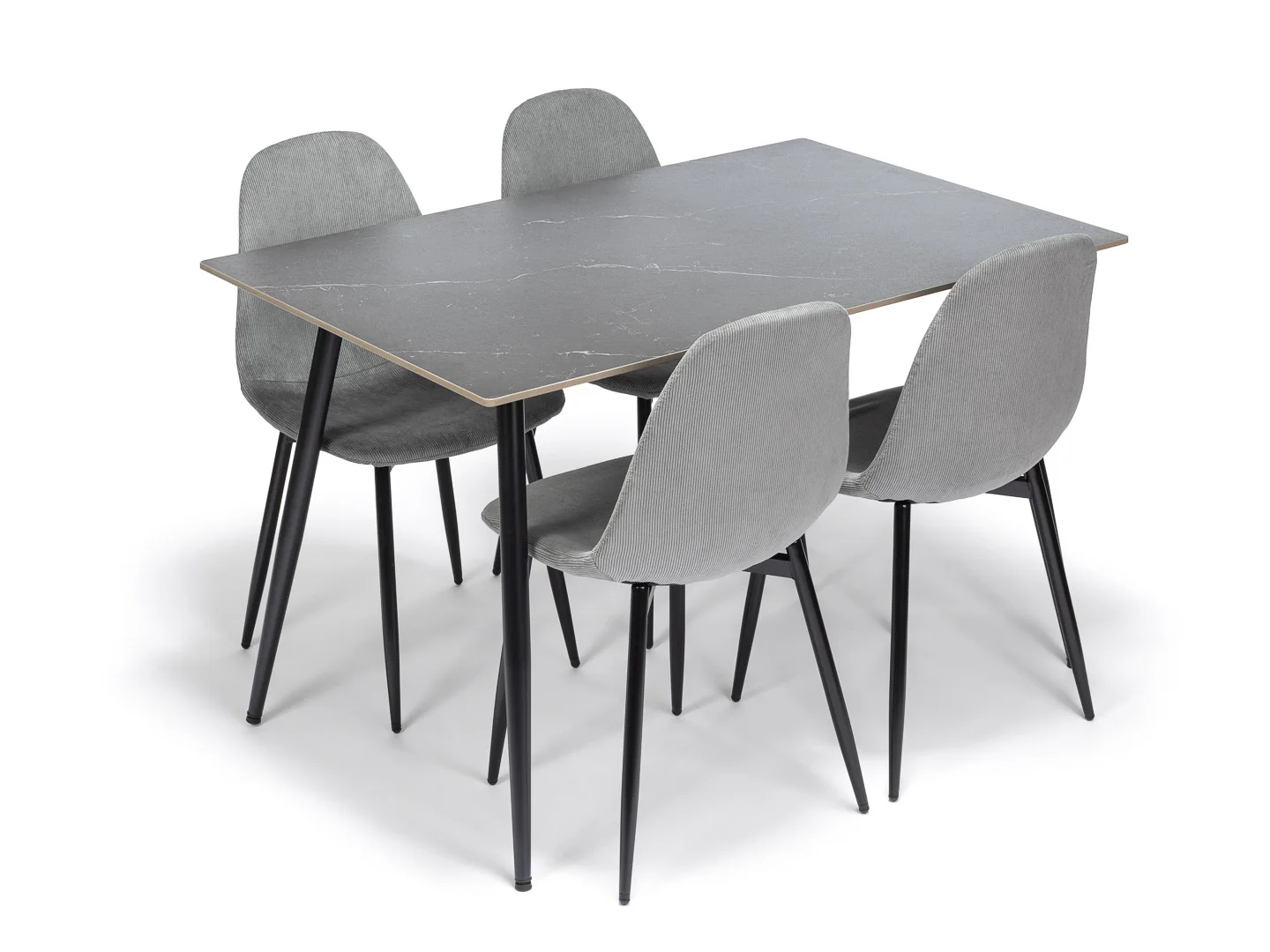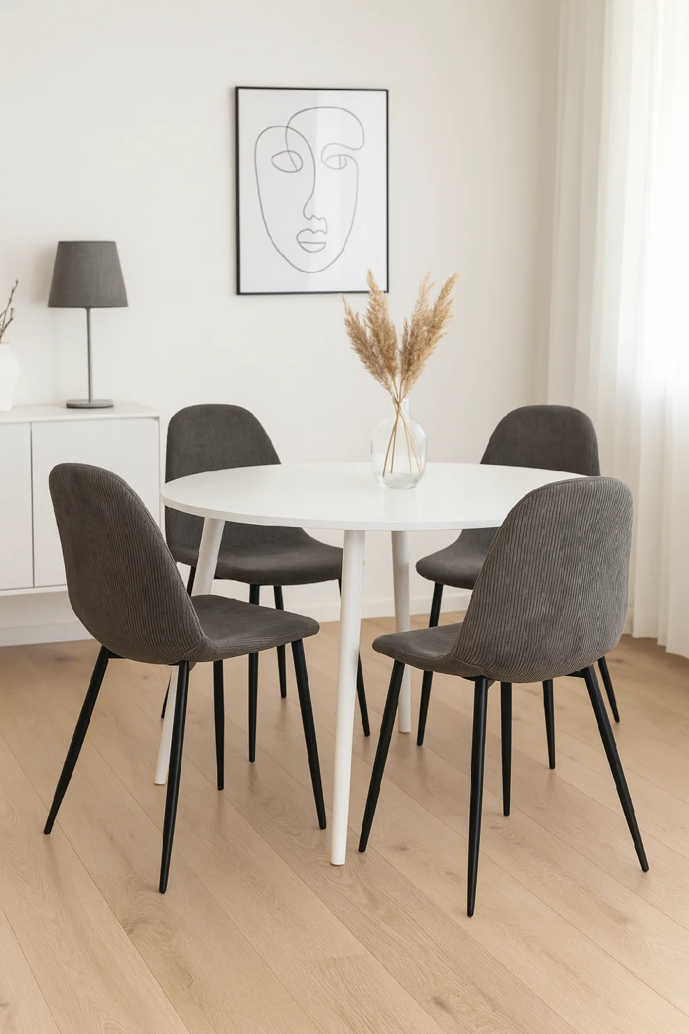 Elegantní židle s moderním minimalistickým vzhledem. Pohodlné čalounění v šedém manšestrovém provedení. Stabilní kovové nohy v černém provedení. Ideální doplněk do jídelny, kuchyně i pracovny. Spojuje komfort, nadčasový design a odolnost.
