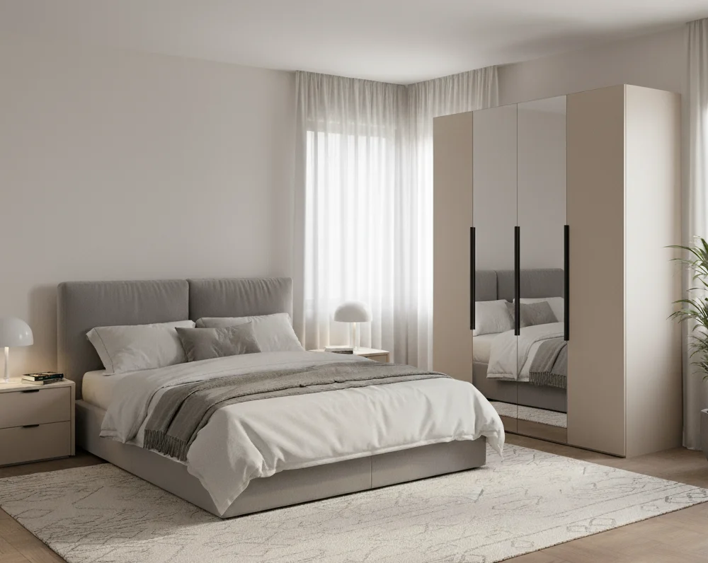 Vneste do své ložnice klid a dokonalý řád s elegantní šatní skříní NICEA 180. Její moderní minimalistický design v uklidňujícím hlínovém odstínu doplňují výrazné černé úchytky, které jí dodávají jedinečný charakter. Za čtyřmi dveřmi (dvoje dveře zrcadlo) se skrývá velkorysý a dokonale organizovaný prostor: extra široká šatní tyč uprostřed a dva symetrické regálové systémy po stranách poskytují maximum úložného místa pro veškeré vaše oblečení a doplňky. S šířkou 180 cm je ideálním řešením pro páry i jednotlivce s náročností na prostor.