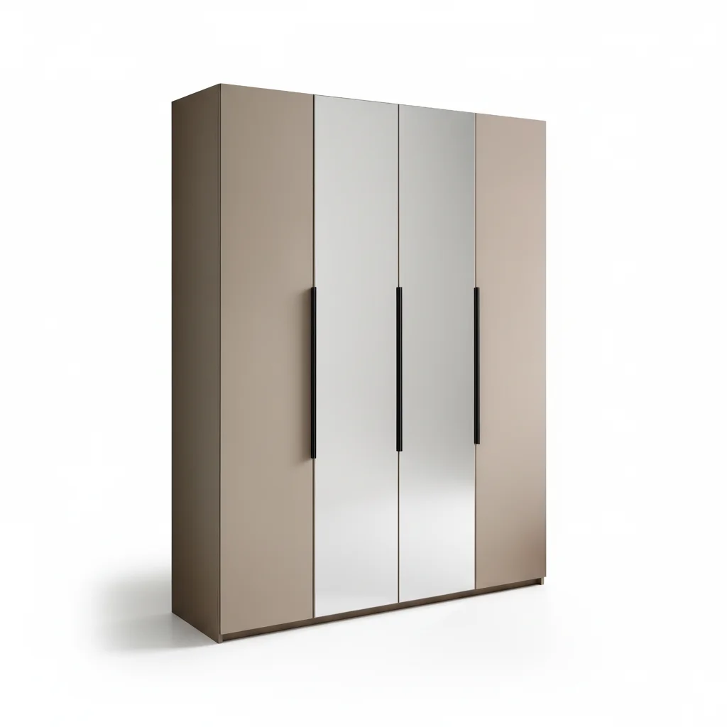 Elegance v každém detailu Design skříně sází na minimalistickou estetiku. Hladké čelní plochy ve velmi trendy, teplém hlínovém (clay) odstínu působí neuvěřitelně harmonicky a snadno je sladíte s různými styly interiéru. Výrazným prvkem jsou dlouhé vertikální úchytky v matně černé barvě, které vytvářejí sofistikovaný kontrast a usnadňují otevírání čtyř klasických dveří (dvoje se zrcadlem).