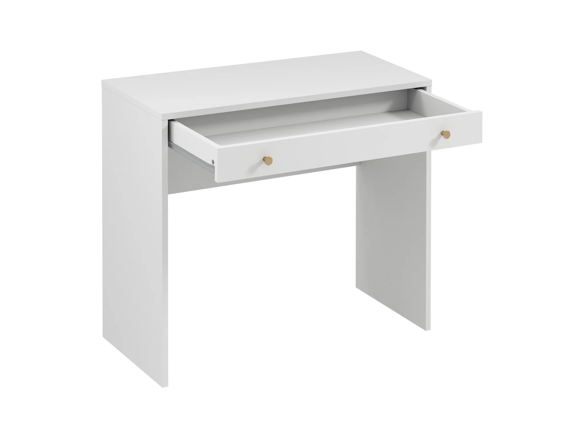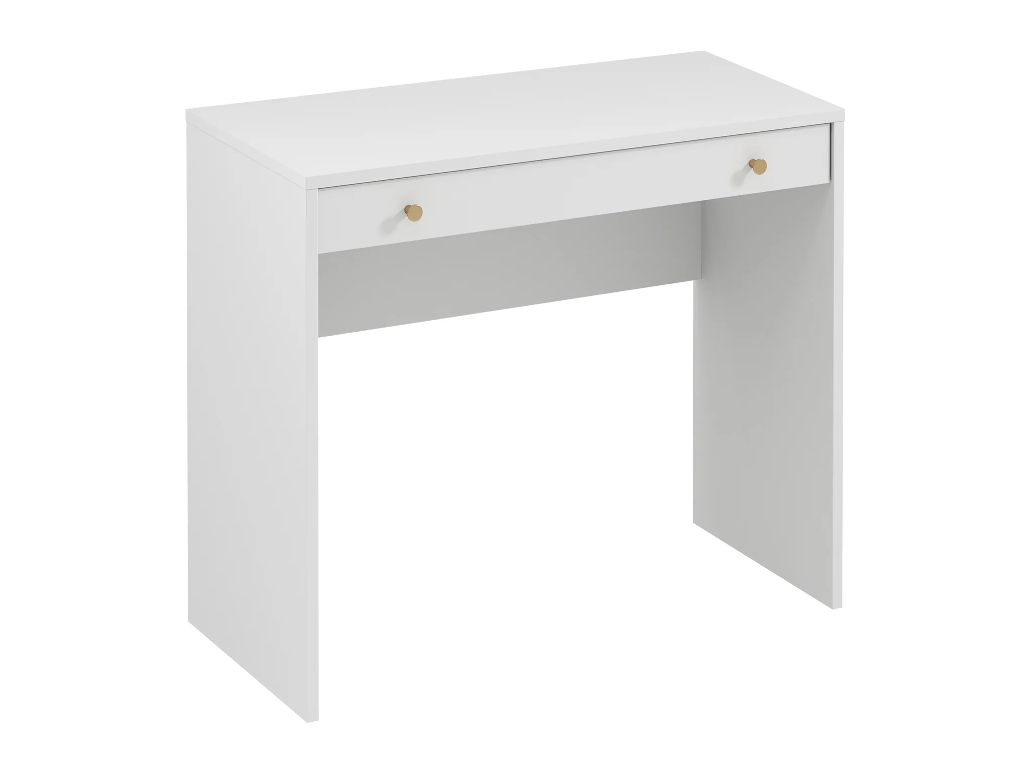 Psací stůl/toaletka REL B1 disponuje 1 zásuvkou. Kolekce nábytku REL – elegantní a funkční řešení pro moderní interiér Bílý dekor pro svěží a nadčasový glamour vzhled Kovové matné zlaté úchytky pro jemný luxusní akcent Korpus z laminované desky o tloušťce 18 mm – odolný vůči poškození a snadno udržovatelný Zásuvky s kolečkovým pojezdem – hladké a tiché otevírání Praktická kombinace