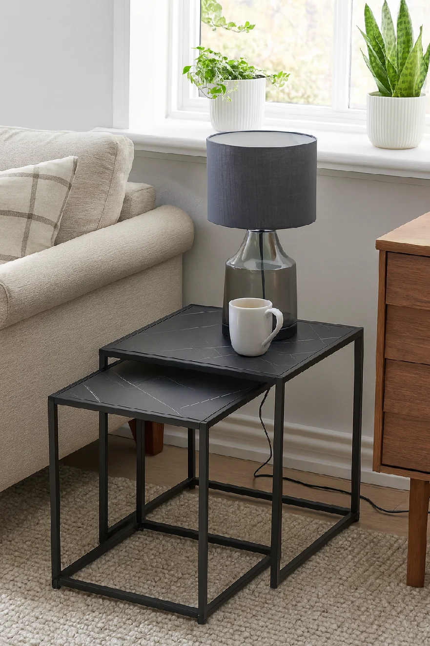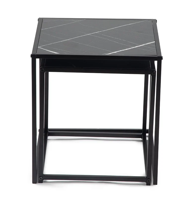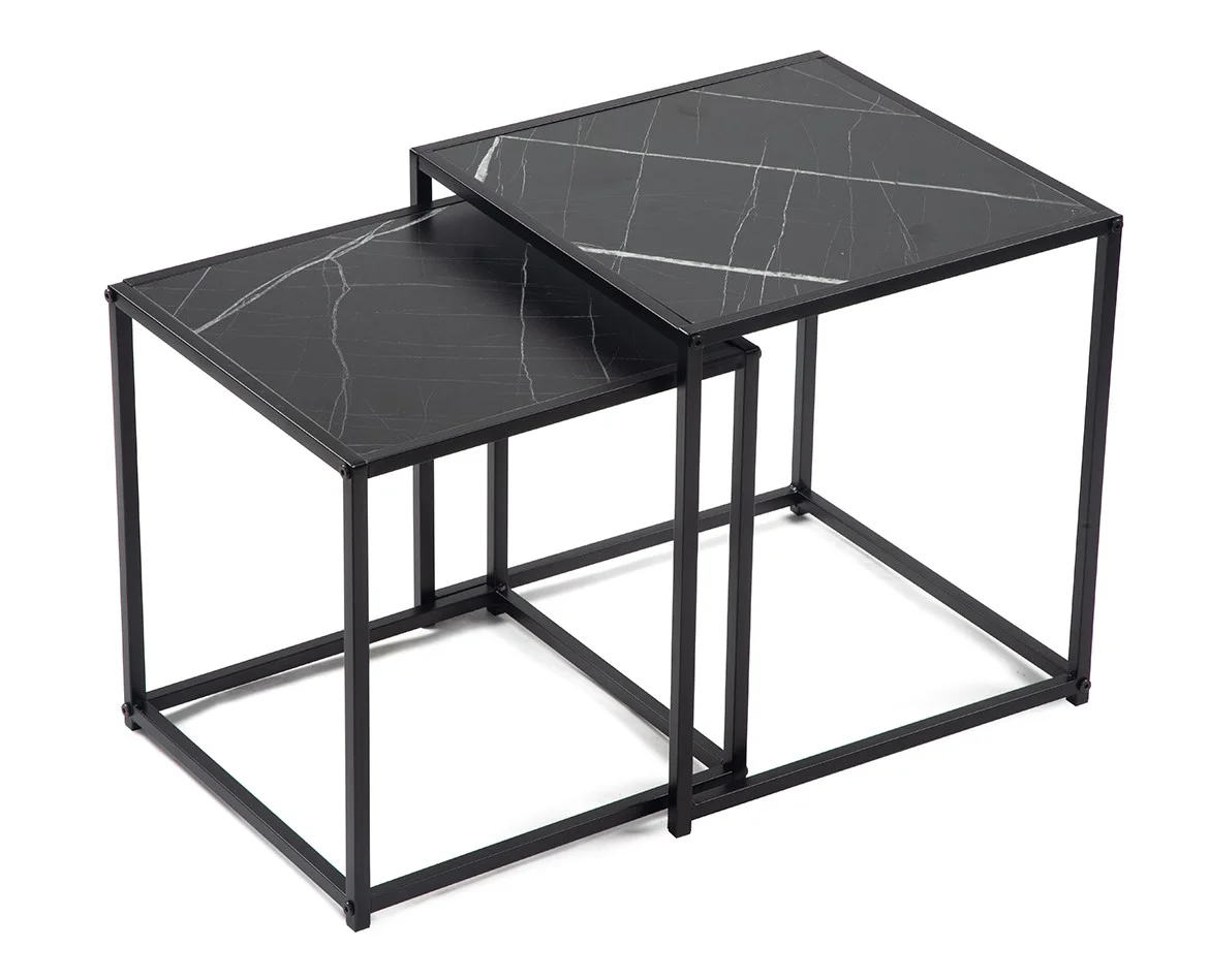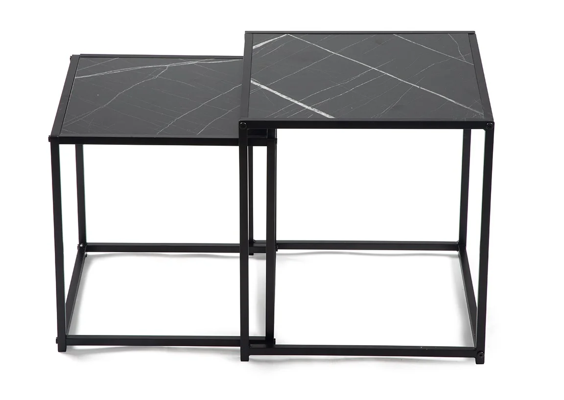 Sada dvou moderních konferenčních stolků s elegantním designem. Stolové desky v černém mramorovém dekoru působí luxusně a stylově. Stabilní kovová konstrukce v černém provedení. Možnost využití samostatně nebo zasunutí jednoho pod druhý pro úsporu místa. Spojuje praktičnost, variabilitu a sofistikovaný vzhled.