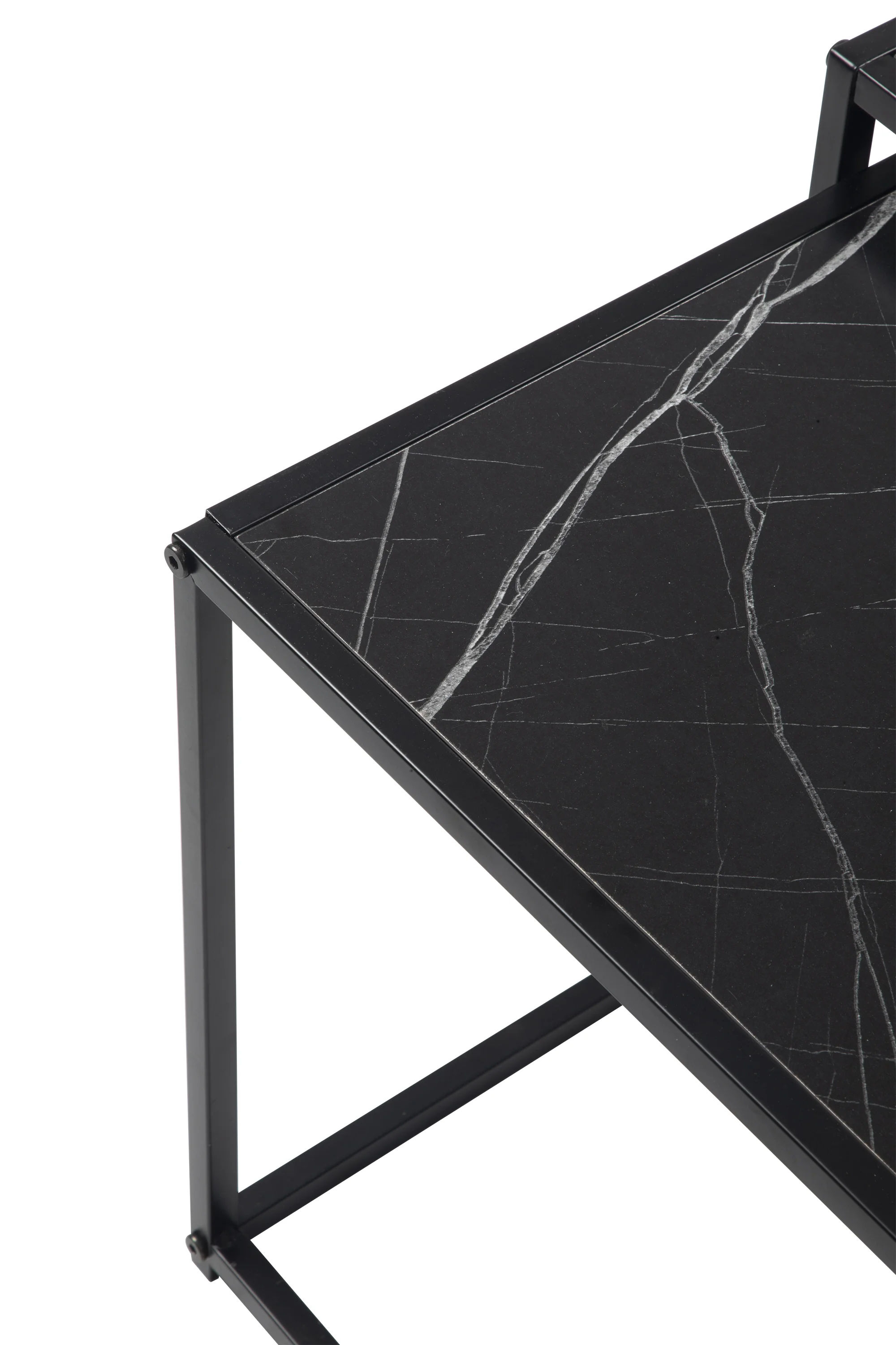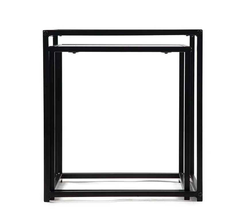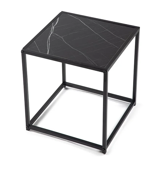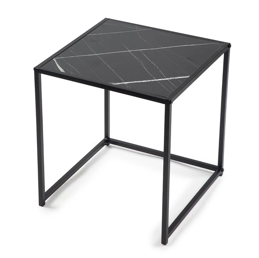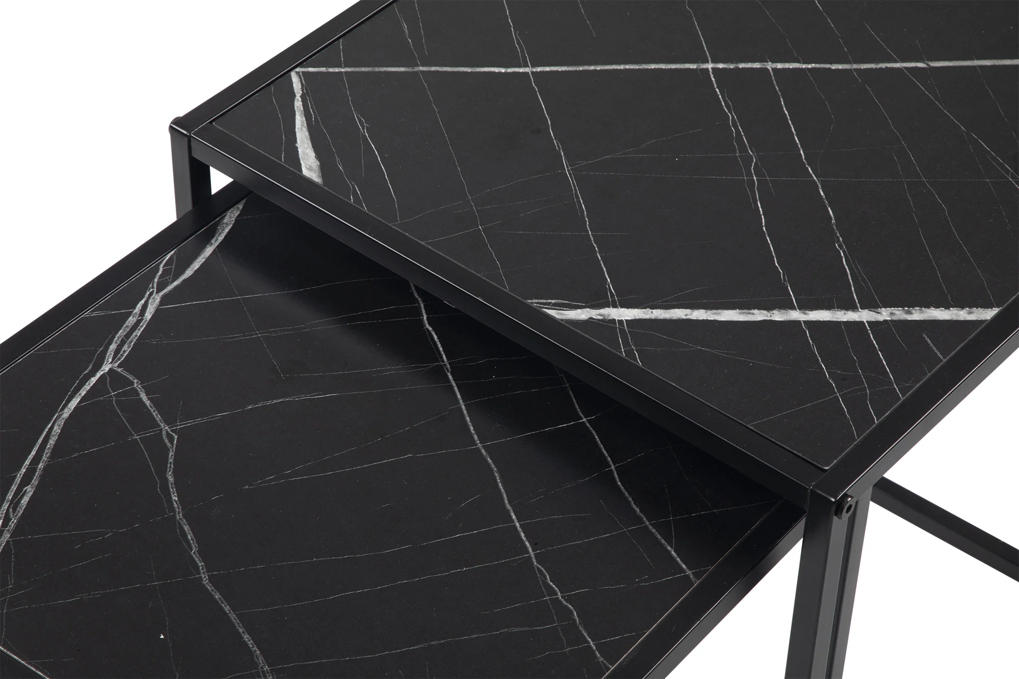 Sada dvou moderních konferenčních stolků s elegantním designem. Stolové desky v černém mramorovém dekoru působí luxusně a stylově. Stabilní kovová konstrukce v černém provedení. Možnost využití samostatně nebo zasunutí jednoho pod druhý pro úsporu místa. Spojuje praktičnost, variabilitu a sofistikovaný vzhled.