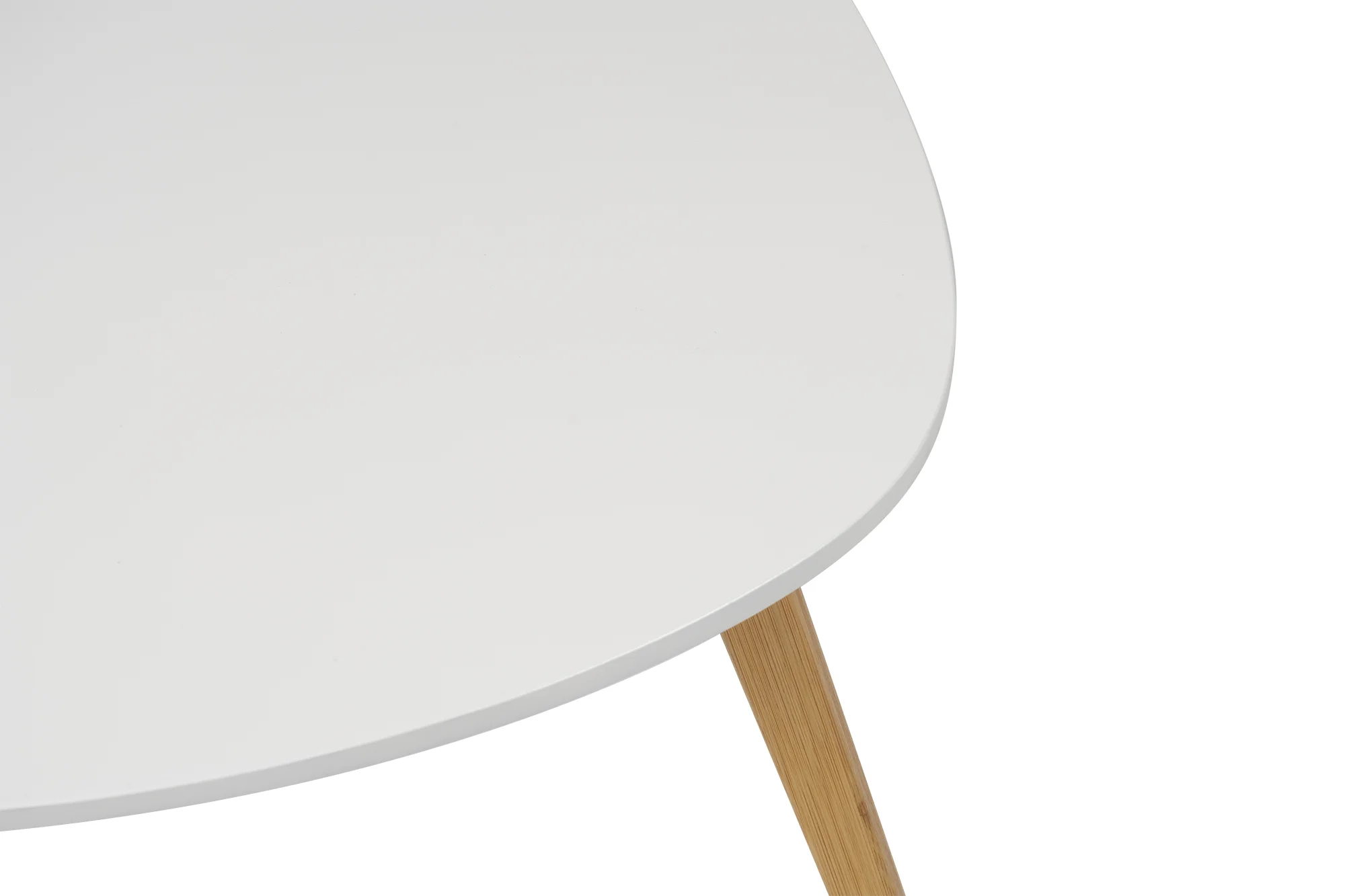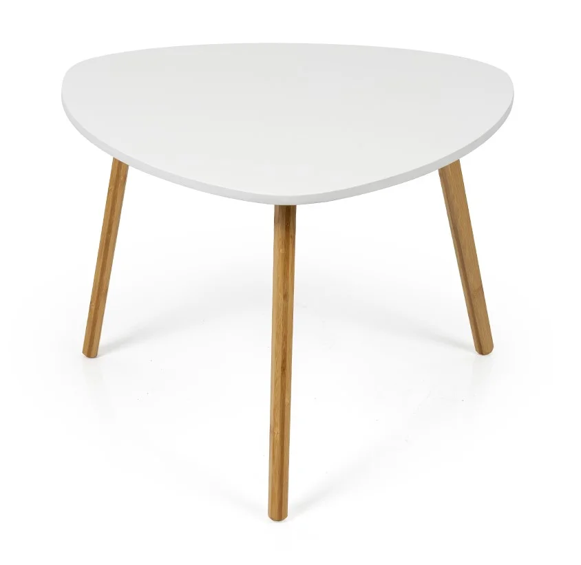 Moderní konferenční stolek s originálním tvarem desky. Bílá stolová deska působí čistě a elegantně. Stabilní nohy z přírodního dřeva dodávají teplý a skandinávský vzhled. Vhodný do obývacího pokoje či moderní pracovny. Kombinace jednoduchosti, praktičnosti a stylového designu.