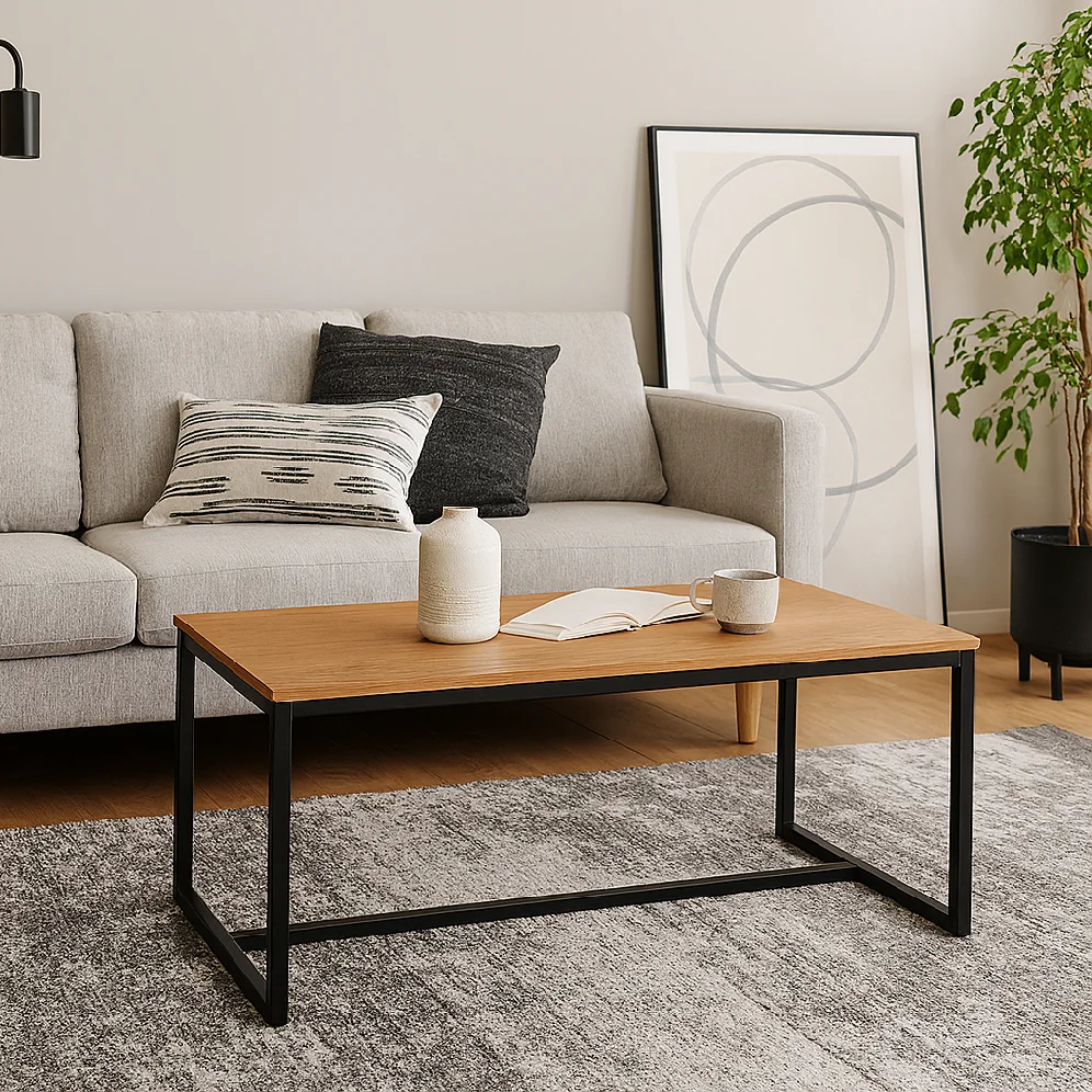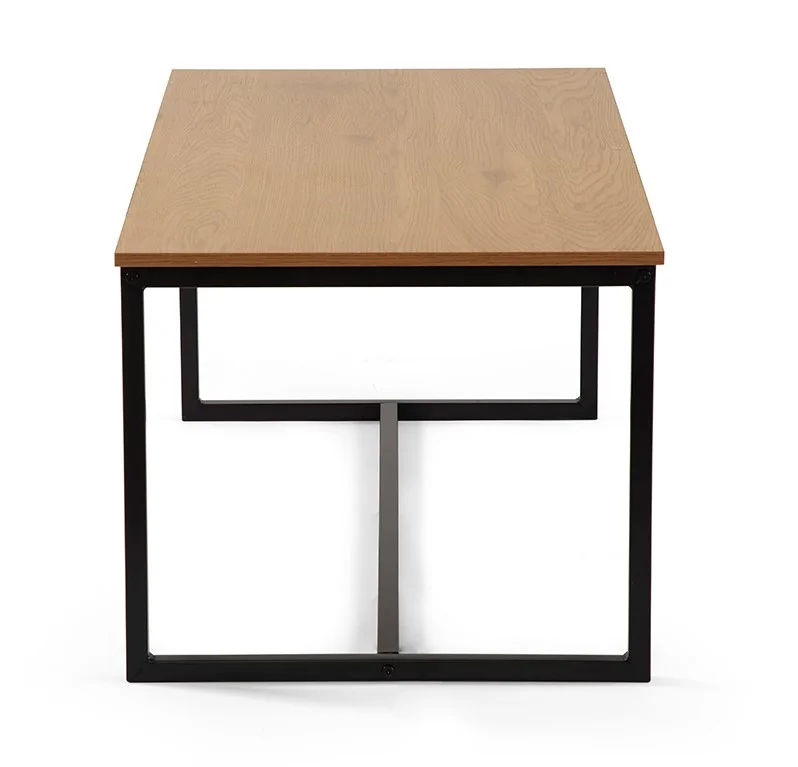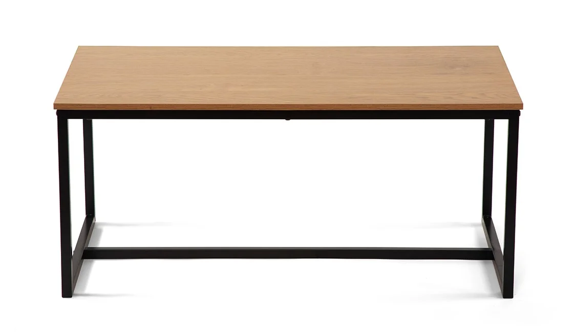 Moderní konferenční stolek s jednoduchým designem. Stolová deska v dekoru přírodního dřeva dodává interiéru hřejivý vzhled. Stabilní kovová konstrukce v černém provedení. Ideální do obývacího pokoje či pracovny. Spojuje praktičnost, odolnost a nadčasový styl.
