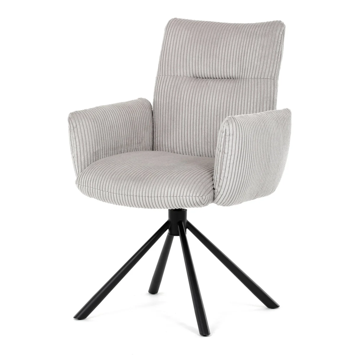Jídelní židle DCH-D1332 CRM2 značky Autronic v krémové manšestrové látce kombinuje elegantní design s vysokým komfortem sezení díky výraznému polstrování sedáku, opěradla a područek. Potah z jemné manšestrové látky zajišťuje příjemný dotek a vizuálně podtrhuje nadčasový vzhled židle. Konstrukce nohou je vyrobena z černě práškovaného kovu, který poskytuje stabilitu a dlouhodobou odolnost proti opotřebení. Otočný 360° vratný mechanismus umožňuje plynulý a tichý pohyb, což zvyšuje ergonomii a usnadňuje manipulaci s židlí v jídelním prostoru. Vyšší polstrování přispívá k pohodlnému sezení i při delším užívání, zatímco pevné područky podporují správnou polohu paží a přispívají k celkové ergonomii. Díky kombinaci kvalitních materiálů a funkčních prvků je židle vhodná pro moderní jídelny i reprezentativní prostory s nosností odpovídající běžnému domácímu použití.